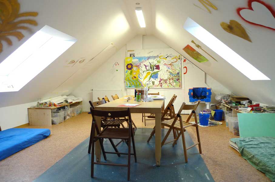 Im Wulf Alexander-Strauer-Haus, einer therapeutischen Wohngruppe für junge Menschen, wurde der Dachboden zum Atelier ausgebaut. Dort treffen sich jede Woche 5-7 Jugendliche zum Malen, Zeichnen, Modellieren, Quatschen….